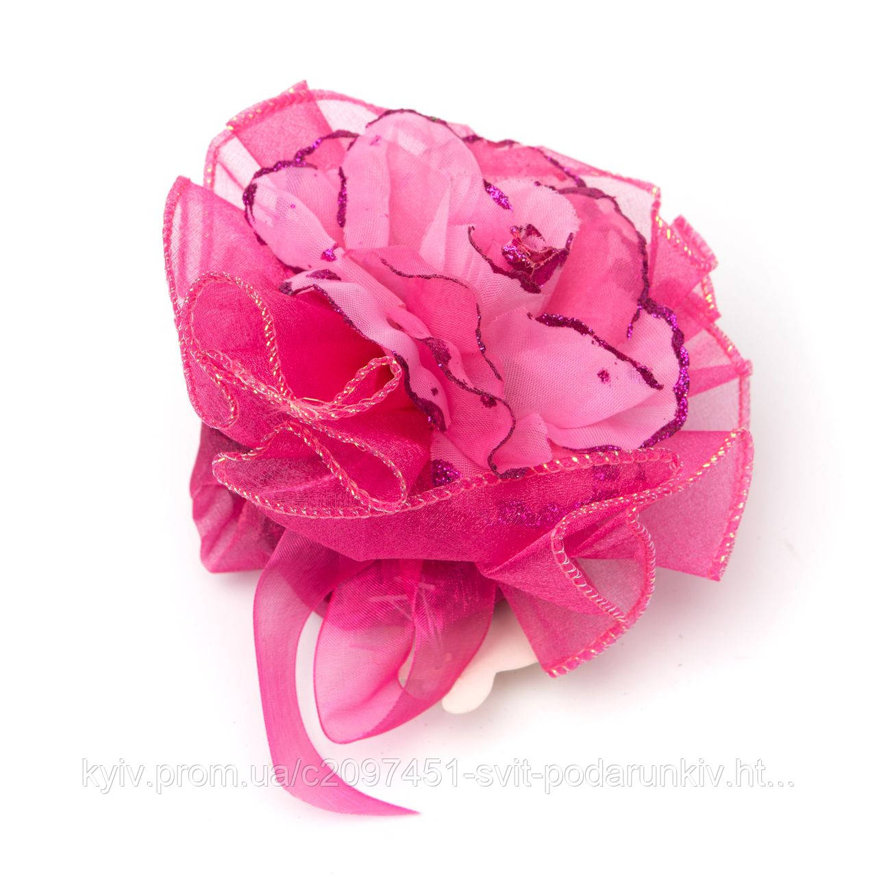 Виріб виготовлений у формі мішечка, зверху розпустився ніжно-рожева квітка з блискітками, а під ним розміщена пахта частина примірника. Напівпрозора тканина створює ефект загадковості та романтичності. Така яскрава прикраса обов'язково приверне увагу багатьох відвідувачів кімнати.