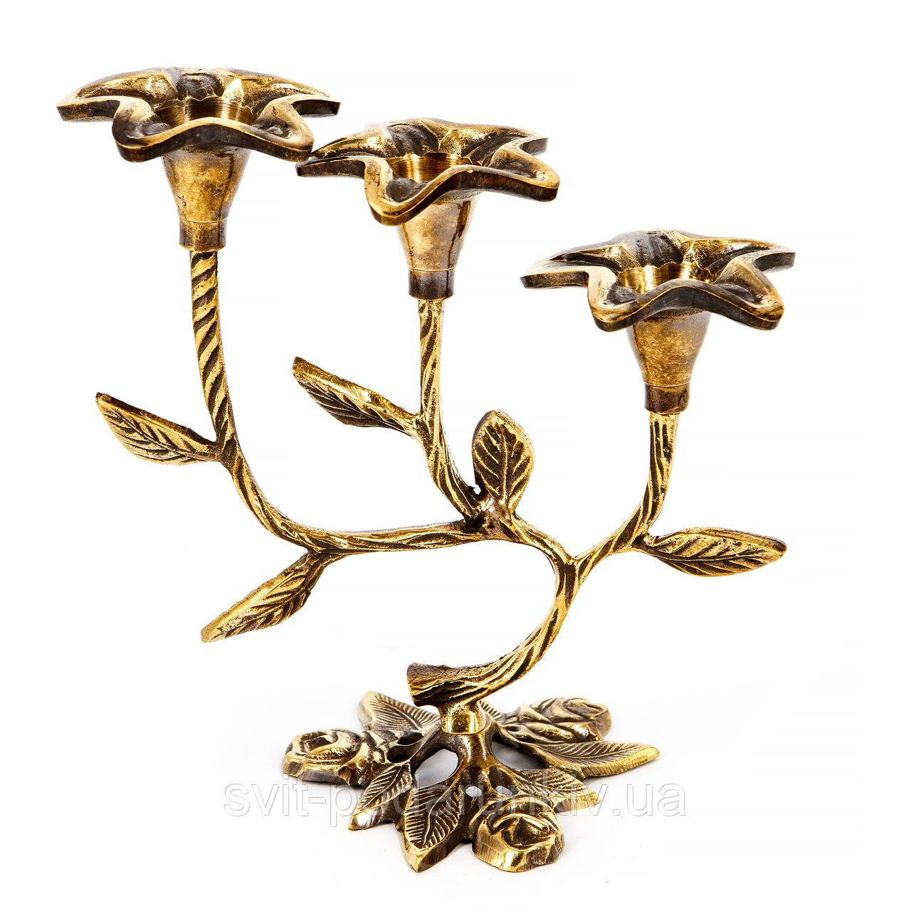 Підсвічник-"деревце" на три свічки зроблений із латуні. Металевий сплав штучно зістарений і патинований, і свічник скидається на старовинні мідні або бронзові предмети.