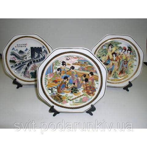 Прекрасна тарілка виготовлена з кераміки у формі шестикутника, оформленого периметром золотою фарбою. Зображення відокремлене від країв витонченою круглою золотою облямівкою. Уміло виготовлене з фарфору та тонко розкладено вручну за східними мотивами, ця страва створює цікавий фокус, хай де воно буде. Тарілка встановлюється на витончену підставку, яка входить до комплектації виробу.